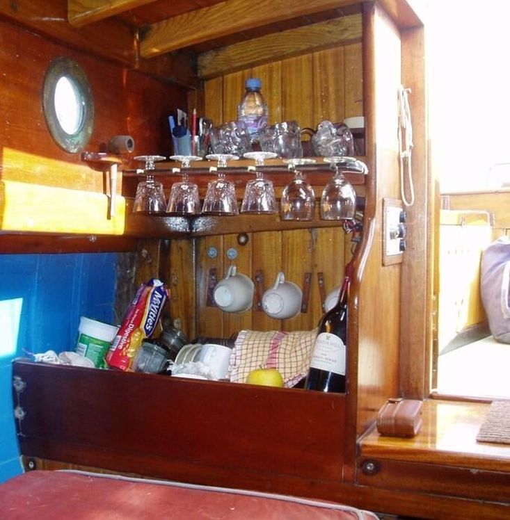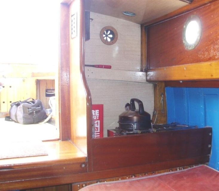 Companionway step in, starboard purpose built glass / crockery and stowage. Port side is the galley facility with a double burner spirit stove .