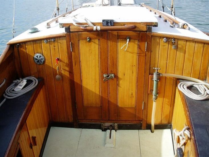 Larch below the water line Elm sawn frames interspersed with steamed frames. Long keel of lead external ballast. A steel cased centreboard box sited below the cabin sole under the bridge deck at the cabin entrance.