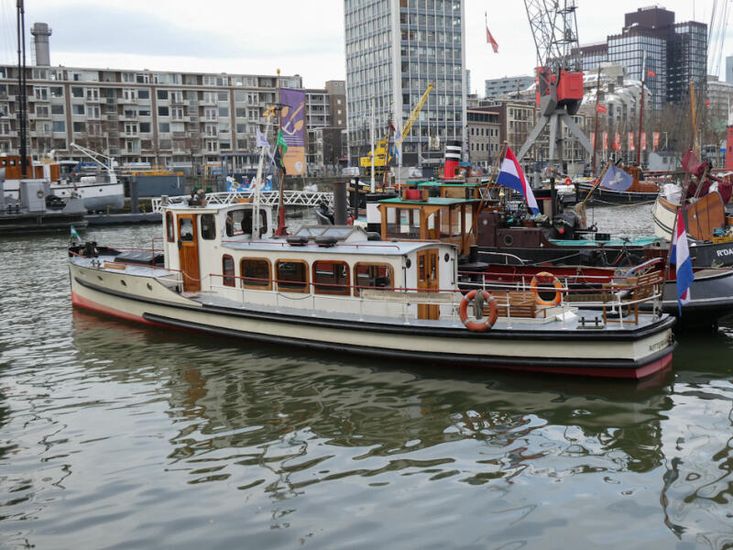 Ehemaliges Direktionsfahrzeug, gebaut im Auftrag der Rotterdamsche Lloyd auf der renommierten Amsterdamsche Werft G. de Vries Lentsch Jr. unter dem Namen ‚Batavia‘. Anschließend diente sie unter dem Namen ‚De Maze‘ für den Hafenbetrieb Rotterdam sowie für das Rotterdamer Trinkwasserunternehmen. Später wurde das Schiff zu einem Salonboot umgebaut, geeignet für Fahrten mit bis zu 12 Gästen. Das offene Cockpit und der Salon bieten reichlich Platz für eine Gesellschaft. Vor dem Steuerhaus ist eine Treppe zum WC sowie zur Vorkajüte, die derzeit als Stauraum genutzt wird, aber einfach in Schlafgelegenheit umgewandelt werden kann. Dies ist kein gewöhnliches Ausflugsschiff. Das Fahrzeug eignet sich in besonderem Maße für maßgeschneiderte Einsätze, wie z. B. private Rundfahrten, geschäftliche Empfänge, kulturelle Programme und Themenfahrten durch sowohl die historischen als auch die modernen Hafengebiete von Rotterdam. In dieser Funktion wird sie derzeit auch betrieben. Der Verkäufer verfügt über eine Genehmigung, um mit maximal 12 Gästen in ausgewiesenen Bereichen des Rotterdamer Hafengebiets zu fahren und anzulegen – ein wertvolles und keineswegs selbstverständliches Privileg.